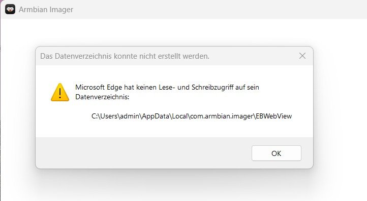 Has anyone here experienced the same problem on trying to install "Armbian Imager" under Windows 11? Upon running the respective exe-file and - no matter what target directory I choose - I get a failure meassage, somewhat like this: The directory could not be established: Microsoft Edge has no Read/Write access rights to its directory: C:\Users\admin\AppData\Local\com.armbian.imager\EBWebView Should the same issue have been posted here somewhere else, I do apologize. However, before creating the help request I did try to find any entries of similar content, but in vain. So if there's already any remedial comment on this available in the Armbian community, please provide the link. Thanks a lot in advance.