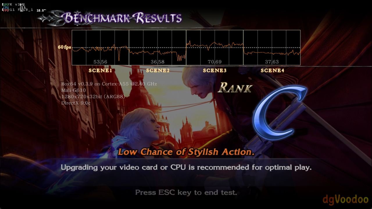 Armbian 25.11.2 Noble XFCE (BSP Kernel: 6.1.115) + PanVk - mesa 26.0 (https://launchpad.net/~ernstp/+archive/ubuntu/mesaaco) + box64 3.9 (https://ryanfortner.github.io/box64-debs/) + wine-10.14-staging-tkg-ntsync-amd64-wow64 (https://github.com/Kron4ek/Wine-Builds/releases/tag/10.14) + dgVoodoo2 (https://github.com/dege-diosg/dgVoodoo2/releases) + DXVK-stripped v1.6.1 ~60fps@720p Noted: . The DX9 version of the game is black-screen. . The DX10 version works. However, it will crash immediately after the tutorial stage because the PanVk driver still lacks the "Geometry Shaders" feature. . By using dgVoodoo2, the DX9 black screen issue was fixed. Devil May Cry 4 (DX9 + dgVoodoo2 + DXVK) Devil May Cry 4 (DX10) -