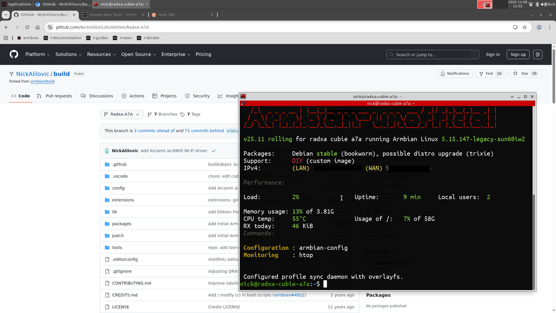https://github.com/armbian/os/commits/25.11.0-trunk.367/git_sources.json This file determine state (hash) of sources. It's not a straightforward process, but one can recreate exact image (except userspace packages, which versions are not stored) This file has to be here https://github.com/armbian/build/commit/31e82512cc60a74f56b710aa2971d7dc2beec9b9 One day, this will be done better Sadly there is too much of such e-waste and way way too little people willing to maintain them in their limited private time. I am sure you can find a working image somewhere in our archives so you don't need to throw it away, but we cannot fool you & ourselves to be able to keep this board maintained. -