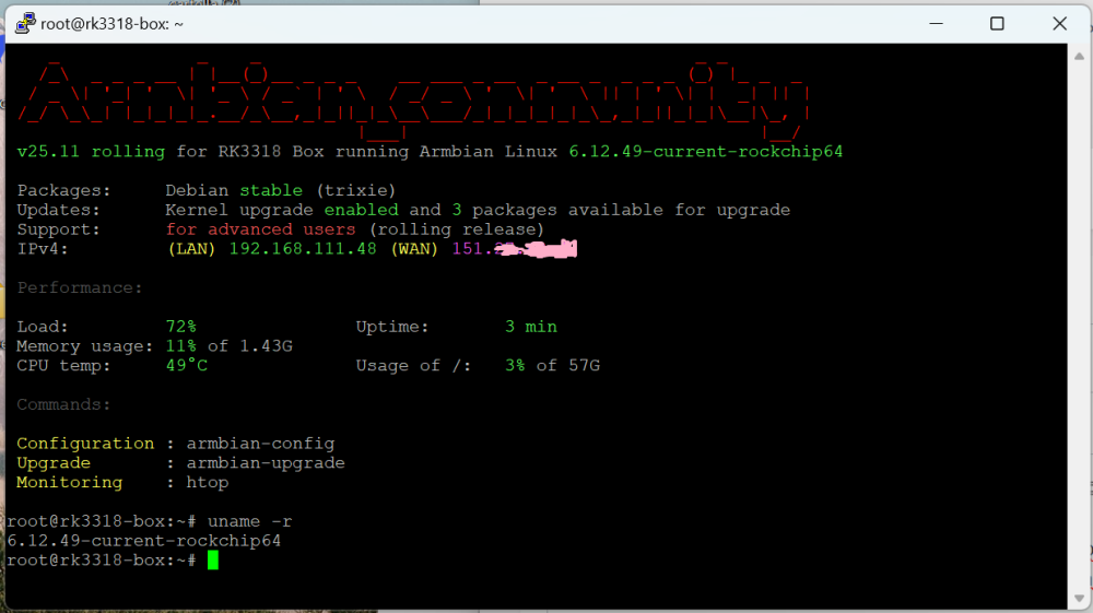 Hi, welcome everyone. I’m using an H50 TV box that I was about to throw away because I thought I had completely bricked it. I disassembled it and found the pins to activate maskrom mode. I think this could be useful for everyone. I then installed the current image, and everything seems to work except for the HDMI output (blank screen). Do you have any suggestions? Thanks. Some data and photo below. In case you want to install please note that also multitool fails to activate the HDMI, so you will need SSH to config. SOC: RK3188 (Hopefully - I did not remove the heatsink) eMMC: Samsung KLMBG4GEAC-B001 32GB (64x4) eMCP: Samsung KMQN10006B 8 GB eMMC + 1 GB LPDDR3 RAM Wi-Fi IC 339S0209 2.4G/5G LAN working WIFI Working ---------------------------- root@rk3318-box:~# lscpu Architecture: aarch64 CPU op-mode(s): 32-bit, 64-bit Byte Order: Little Endian CPU(s): 4 On-line CPU(s) list: 0-3 Vendor ID: ARM Model name: Cortex-A53 Model: 4 Thread(s) per core: 1 Core(s) per cluster: 4 Socket(s): - Cluster(s): 1 Stepping: r0p4 CPU(s) scaling MHz: 60% CPU max MHz: 1008.0000 CPU min MHz: 600.0000 BogoMIPS: 48.00 Flags: fp asimd evtstrm aes pmull sha1 sha2 crc32 cpuid Caches (sum of all): L1d: 128 KiB (4 instances) L1i: 128 KiB (4 instances) L2: 256 KiB (1 instance) NUMA: NUMA node(s): 1 NUMA node0 CPU(s): 0-3 Vulnerabilities: Gather data sampling: Not affected Indirect target selection: Not affected Itlb multihit: Not affected L1tf: Not affected Mds: Not affected Meltdown: Not affected Mmio stale data: Not affected Reg file data sampling: Not affected Retbleed: Not affected Spec rstack overflow: Not affected Spec store bypass: Not affected Spectre v1: Mitigation; __user pointer sanitization Spectre v2: Not affected Srbds: Not affected Tsa: Not affected Tsx async abort: Not affected Vmscape: Not affected root@rk3318-box:~# free -l total used free shared buff/cache available Mem: 1504636 291372 1037440 46940 297848 1213264 Low: 1504636 467196 1037440 High: 0 0 0 Swap: 752316 0 752316 SOME TESTS ON THE HDMI ISSUE: hdmi_debug_20251008_230528.log hdmi_test_20251008_230948.log