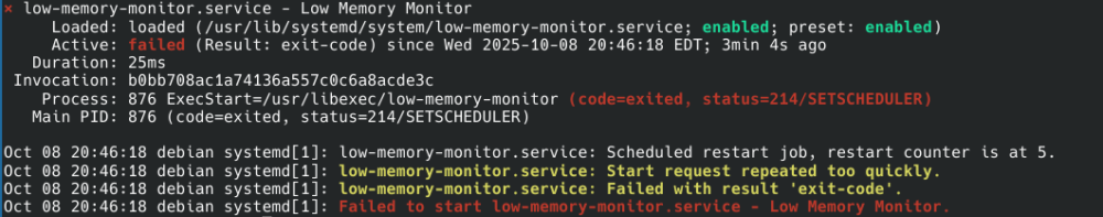 Hardware: Orange PI 5 Plus (rk3588) Operating System: Debian Trixie (pure, except EFI boot and Armbian edge kernel) EFI Source: https://github.com/edk2-porting/edk2-rk3588 The boot messages, after a few starts (spaced apart) of the low-memory-monitor.service, say there's a failure to start it. After booting is complete, here's a screenshot of the output of: systemctl status low-memory-monitor.service This error didn't show up until I installed a number of packages. I tracked down the offending package from the Trixie repository: Package: xfsprogs Version: 6.13.0-2+b1 Size: 4774 kB Once this package was removed, the error vanished, and a repeat of the above Status command reported low-memory-monitor-service as active and okay. I also found that, while the error occurred with the Armbian edge 6.16.4 kernel, it did NOT occur with the Debian 6.16.3 kernel. Kernel With The Error (kernel source: Armbian) --------------------- Package: linux-image-edge-rockchip64 (Armbian Linux edge kernel image 6.16.4-edge-rockchip64) Version: 25.8.1 Size: 282 MB Kernel Without The Error (kernel source: trixie-backports) ------------------------ Package: linux-image-6.16.3+deb13-arm64-unsigned (Linux 6.16 for 64-bit ARMv8 machines) Version: 6.16.3-1~bpo13+1 Size: 210 MB I also briefly tried regressing the Armbian edge kernel from 25.8.1 (6.16.4) to the previously available version of 25.5.2, which was 6.16.0-rc3 (I think). The error occurred with that kernel as well.