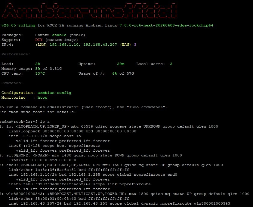 apply this patch for a working wifi: diff --git a/extensions/radxa-aic8800.sh b/extensions/radxa-aic8800.sh index e3e99eaa8..7ab721353 100644 --- a/extensions/radxa-aic8800.sh +++ b/extensions/radxa-aic8800.sh @@ -10,7 +10,7 @@ function extension_finish_config__install_kernel_headers_for_aic8800_dkms() { function post_install_kernel_debs__install_aic8800_dkms_package() { - if linux-version compare "${KERNEL_MAJOR_MINOR}" ge 6.20; then + if linux-version compare "${KERNEL_MAJOR_MINOR}" ge 7.1; then display_alert "Kernel version is too recent" "skipping aic8800 dkms for kernel v${KERNEL_MAJOR_MINOR}" "warn" return 0 fi