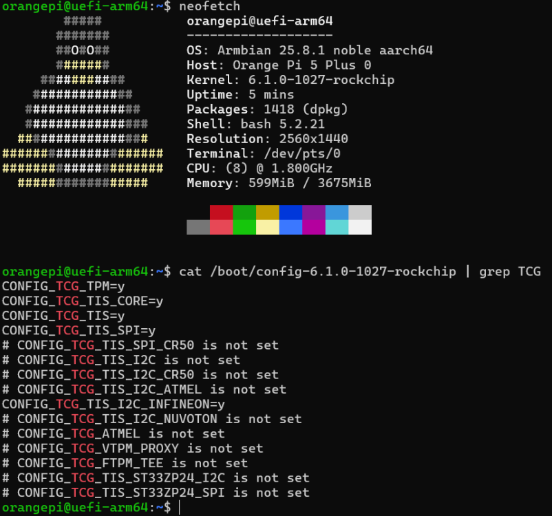 5. Hello, I've been using https://joshua-riek.github.io/ubuntu-rockchip-download/boards/orangepi-5-plus.html with a custom kernel that I built to activate my TPM2.0 device and it works. Now I'm asked to use an UEFI compatible image with my Orange Pi 5 Plus. So what I did is more or less the same thing that in here But instead of the legacy kernel I used the 6.1.115-rockchip-vendor-rk35xx kernel and my device booted, I got an HDMI output, etc. And then I updated it to my custom kernel (6.1.0-1027-rockchip) that has the necessary configurations to allow TPM over SPI. Now I'm trying to activate my TPM2.0 as I did before. To do that I added my compiled *.dtbo (rk3588-spi0-tpm-cs1.dtbo) to /boot/dtb/rockchip/overlay and activated it with armbian-config. After reboot this is my /boot/armbianEnv.txt orangepi@uefi-arm64:~$ cat /boot/armbianEnv.txt verbosity=1 bootlogo=true console=both extraargs=cma=256M overlay_prefix=rk3588 fdtfile=rockchip/rk3588-orangepi-5-plus.dtb rootdev=UUID=3e555b58-fdf4-4e2f-a3af-a8ecfd8034b6 rootfstype=ext4 overlays=spi0-tpm-cs1 param_spidev_spi_bus=0 However I still can't see my tpm under /dev/. I don't know what I'm missing, I'm quite new to this sorry Thank you for your time