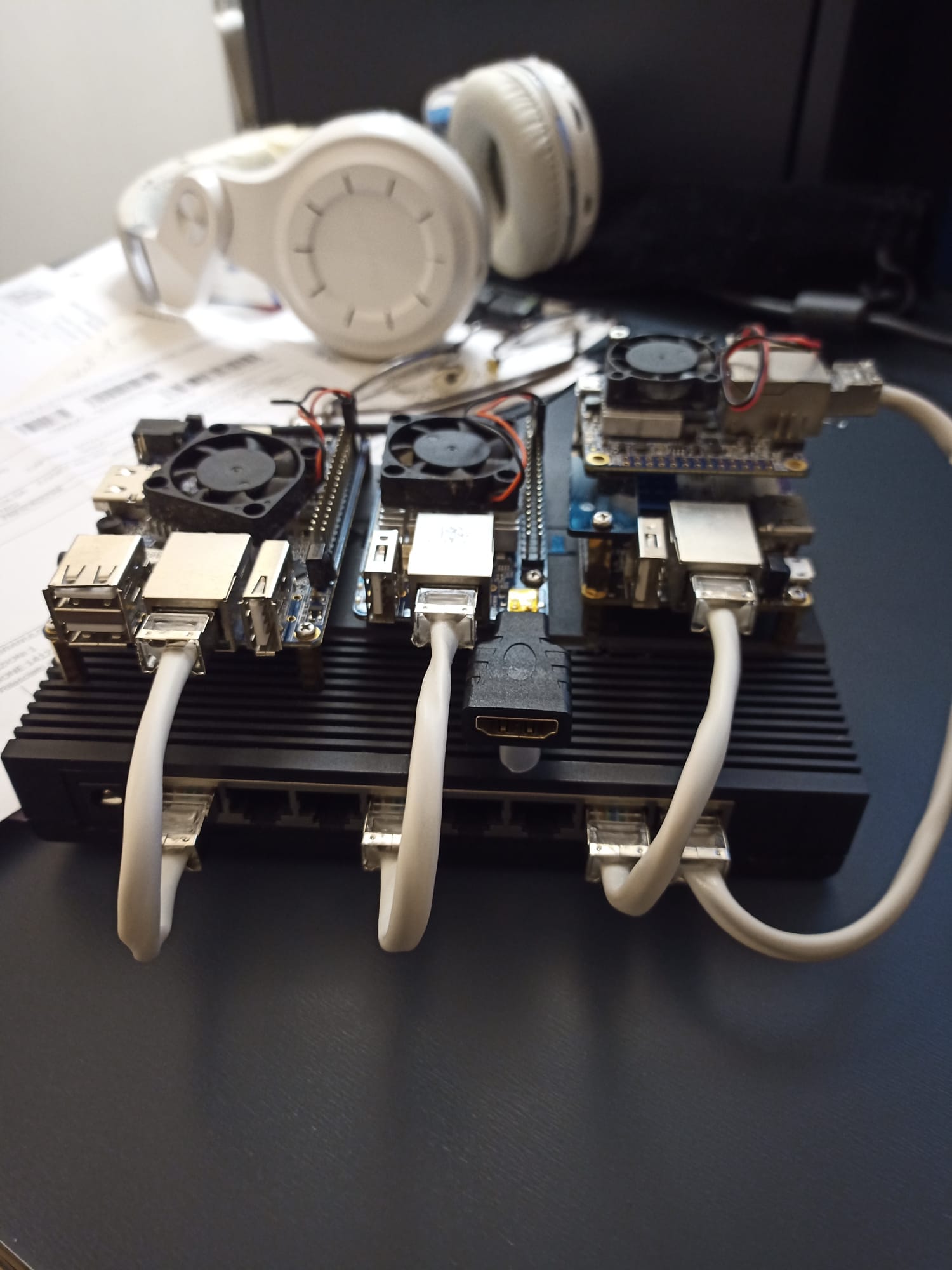 Hello. During the Italian pandemic lockdown I am building a mini cluster with some boards that I have found in my house. I have three OrangePi and one Nanopi Fire3. I assembled them in a box and I connected them via ethernet. I connected the monitor on a OrangePi One plus. The keyboard and mouse are on a blouetooth usb key. I would like to have all Armbian (for the reasons that you all know!). I installed all SD with Armbian Images. Every SBC has the text file with fixed ip parameters. All the network files (etc/network/interface) are well written and in the local network all Armbians are pinging each other ones. I reach them via SSH and they talk with the one that has the keyboard and the monitor. Ok Allright!!